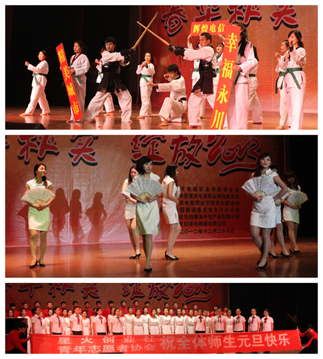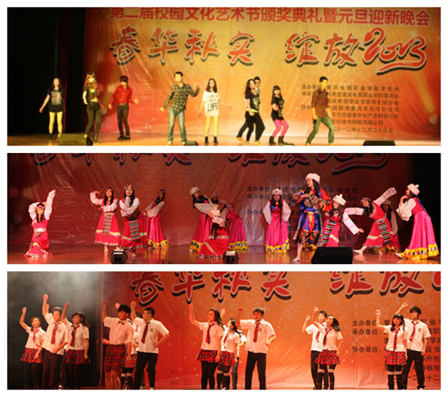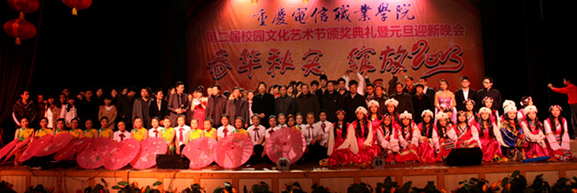 “春华秋实·绽放2013”。 12月29日晚,我校第二届文化活动节闭幕式暨二?一三年新年晚会在学生活动中心四楼隆重举行。91视频网站在线观看院长沈清淮,书记周及至、副书记白成良、副院长钟代军、各职能部门负责人以及作为特邀嘉宾的校企合作单位重庆先特服务外包产业有限公司郑昊行政总监、中国联通重庆市永川分公司陈健总经理、程勇副总经理、重庆航凌电路板有限公司赵勇总经理和家长代表出席了本次大会。我校全体师生一千九百余人共同观看了晚会。