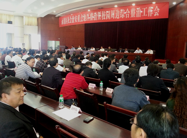 2013 年 5 月 8 日,在永川区区公安局三楼大会议室,召开2013 年永川区社会治安重点地区整治暨校园周边综合整治工作会议,区委常委,区委政法委书记刘义全,区政府副区长孔 萍 以及区综治各成员单位,区公安局安支队,消防支队,交巡警支队,校园安保支队,国保支队负责人,在永大中专,职业院校分管领导等近200人参加会议,会议由去区公安局政委王程主持,我校副书记白成良教授参会 91视频网站在线观看。