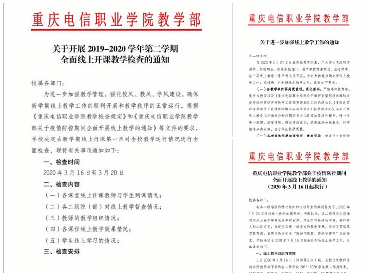 同时,为确保全面线上教学工作顺利开启 91视频播放,教学部发布了《www91关于开展2019-2020学年第二学期线上开学教学检查的通知》,并由全体校领导,各二级91牛党政领导和相关职能部门负责人组成了综合检查组,对我校开展全面线上教学工作进行了专项检查,检查组成员深入各类教学平台,对线上教学的教学组织,线上教学资源准备及利用,线上教学的管理和要求,线上教学的师生互动,学习效果等进行了检查,详细了解教师的教学情况和学生的学习状况,填写《www91线上听课记录表》,并主动与教师交流或交换意见,为提高教学质量打好基础,各二级院也对本单位的教学情况进行了自检自查,并认真填写提交《重庆电信职业职业线上教学检查记录表》以及《www91线上教学情况巡查记录表》。
