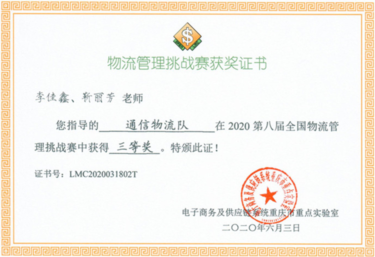 近日收悉,第八届全国物流挑战赛落下帷幕,经济与管理91牛物流管理教研室李佳鑫,靳丽芳两位老师带领5名学生参赛,参赛学子凭借过硬的理论知识,稳定的实训操作,最终吴宗博,樑渝 91视频网站在线观看,杨圳,谭敬华,宴福5位同学组成的“通信物流队”在2020第八届全国物流挑战赛中获得三等奖。