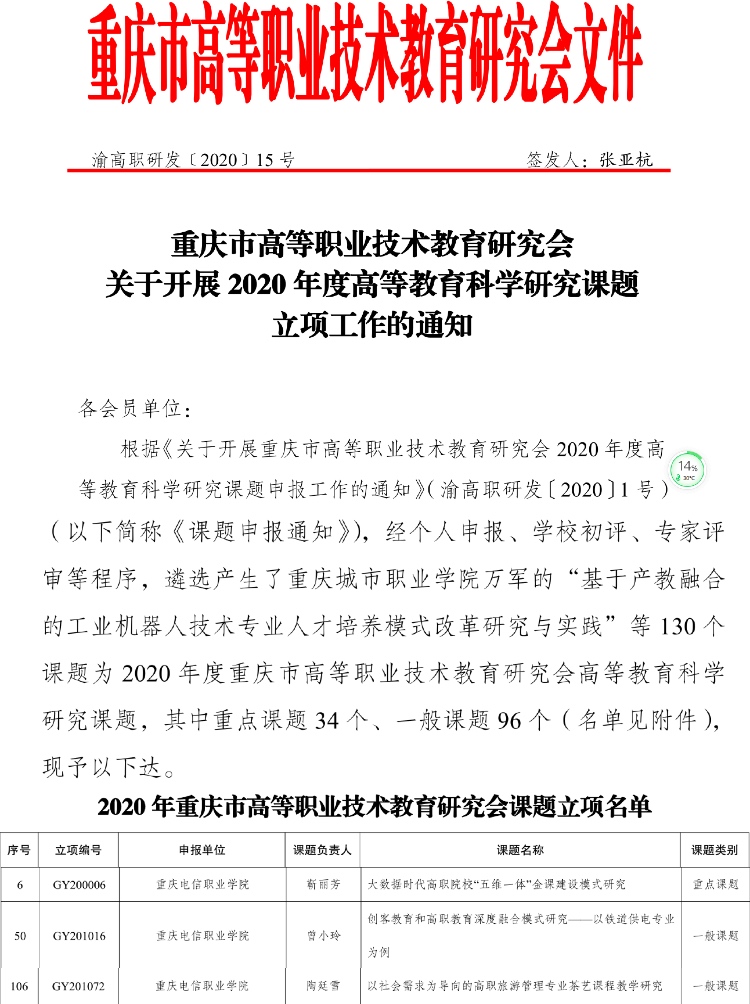 近日,从《重庆市高等职业技术教育研究会关于开展 2020 年度高等教育科学研究课题立项工作的通知》渝高职研发﹝2020﹞15 号文件中获悉,我校靳丽芳,陶廷雪,曾小玲三位老师申报的课题成功立项,其中重点课题1项 91视频网站在线观看,一般课题2项。