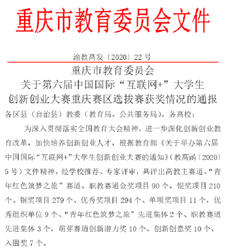在第六届中国国际“互联网+”大学生创新创业大赛重庆赛区中,共评出高教主赛道,“青年红色筑梦之旅”赛道 91牛,职教赛道金奖项目90个,银奖项目210个,铜奖项目279个,优秀奖项目294个,单项奖项目11个,优秀组织单位9个,“青年红色筑梦之旅”先进集体2个,职教赛道先进集体3个,萌芽赛道创新潜力奖10个,创新创意奖10个,入围奖7个。