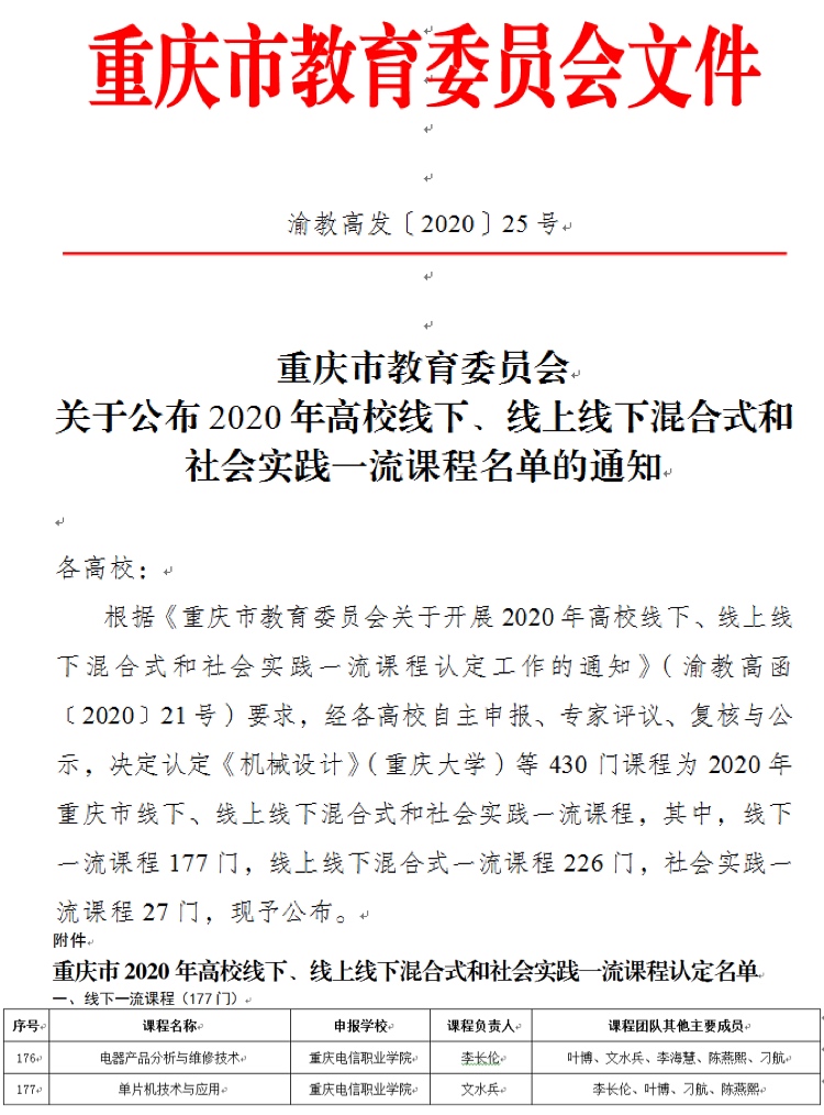 近日,从《重庆市教育委员会关于公布2020年高校线下,线上线下混合式和社会实践一流课程名单的通知》渝教高发〔2020〕25号文件中获悉,我校李长伦老师负责的《电器产品分析与维修技术》和 文水兵老师负责的《单片机技术与应用》2门课程,获得重庆市2020年线下一流课程认定,此次公布的线下一流课程共计177门 91视频网站在线观看,其中职业院校课程共计46门,此项成绩的取得标志我校课程建设取得重大突破。