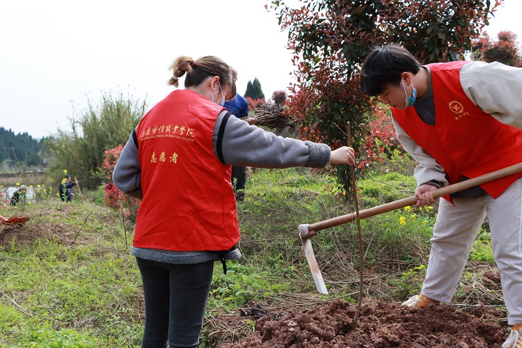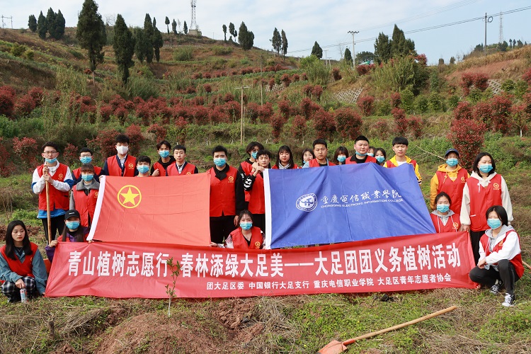 为践行习近平生态文明思想,积极践行“绿水青山就是金山银山”理念,大力推进国土绿化,退耕还林等生态工程建设,3月12日,大足团区委联合www91,中国银行大足支行,大足青年志愿者协会在智凤街道植树基地组织开展了“青山植树志愿行 91视频网站在线观看,春林添绿大足美”植树活动,我校30余名学生代表参加了此次活动。