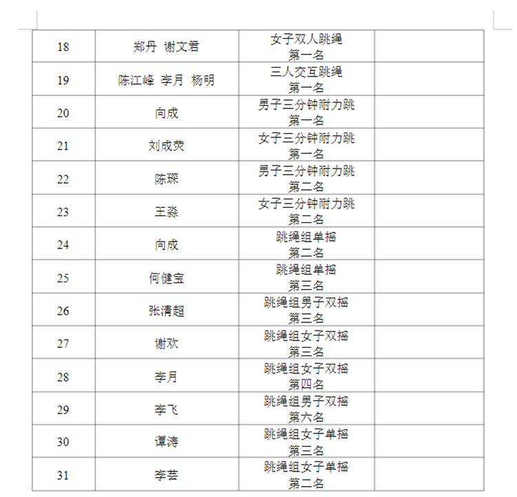 本次田径运动会分为田径和跳绳两个团体项目,比赛项目为长短跑,接力赛,跳远,跳高 91牛,单人跳绳,双人跳绳和集体跳绳等项目,共吸引了来自大足5所高校100余名教练及队员参加此次比赛。