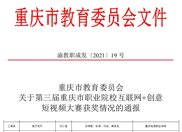 近日,《重庆市教育委员会关于第三届重庆市职业院校互联网+创意短视频大赛获奖情况的通报》(渝教职成发〔2021〕19号)文件发布,我校荣获第三届重庆市职业院校互联网+创意短视频大赛三等奖 91视频网站在线观看。