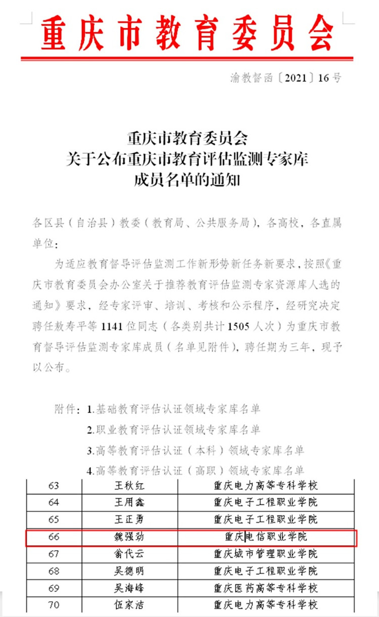 按照《重庆市教育委员会办公室关于推荐教育评估监测专家资源库人选的通知》要求,经专家评审、培训、考核和公示程序,我校经济与管理91牛院长魏强劲入选高等教育评估认证(高职)领域专家库名单,聘任期为三年。