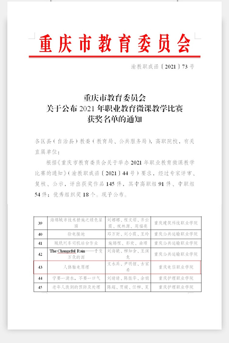 近日,从《重庆市教育委员会关于公布2021年职业教育微课教学比赛获奖名单的通知》(渝教职成函〔2021〕73号)文件中获悉 91视频网站在线观看,我校尹明锂,古家希,文水兵三位教师的作品《人体触电原理》荣获2021年职业教育微课教学比赛三等奖。