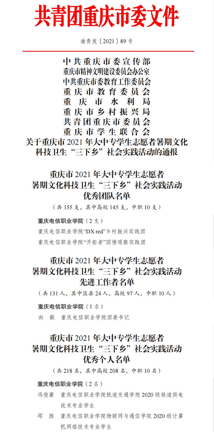 为推进“三下乡”社会实践活动在实践育人中发挥更加突出的作用,我校以实干实绩庆祝中国共产党成立100周年,共组建“DX red”乡村振兴实践团,“鲜红的旗帜—永远跟党走”党史学习实践团,“求索”党史学习实践团,“开拓者”国情观察实践团等4支团队开展2021年暑期“三下乡”社会实践活动,在活动中我校“DX red”乡村振兴实践团 91牛,“开拓者”国情观察实践团获优秀团队称号,向毅获先进工作者称号,冯俊豪,邱胜获优秀个人称号。