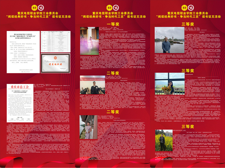 校工会于12月组织开展了“阅读经典好书·争当时代工匠”读书征文评选活动 91牛,收到来自七个工会的投稿28篇,最终6名教师的稿件脱颖而出获得表彰,在本次比赛期间,党委副书记,副校长代敏的征文《怀匠心育匠德践匠行,争做时代工匠》,在重庆市总工会读书征文活动评选中荣获全市二等奖。