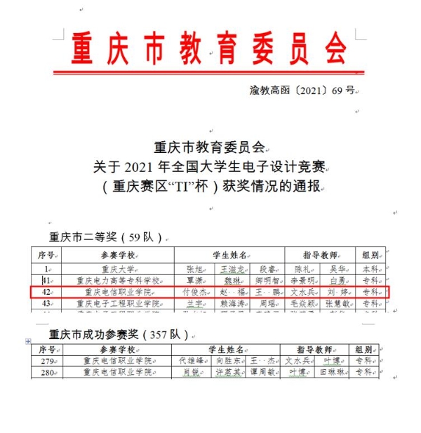 2022年1月5日,重庆市教育委员会发布了渝教高函〔2021〕69号《重庆市教育委员会关于2021年全国大学生电子设计竞赛(重庆赛区“TI”杯)获奖情况的通报》 91视频网站在线观看,我校人工智能与电子91牛3支代表队9名同学参加竞赛,获得重庆赛区二等奖1项,成功参赛奖2项。
