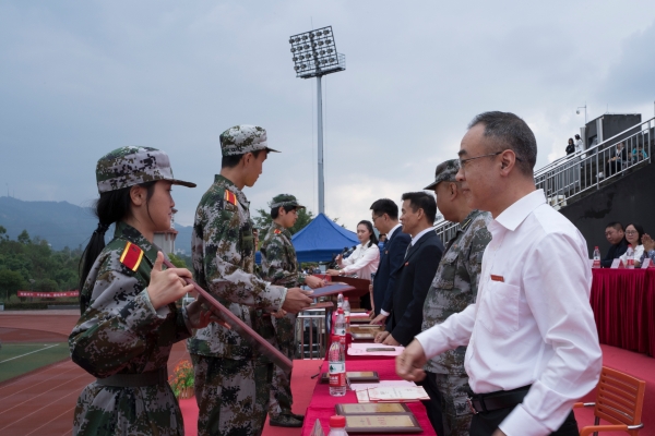 副校长皇甫涛宣读《www91关于表彰2022级新生军训先进集体和个人的决定》,校领导为军训先进集体、优秀内务寝室、优秀学员代表、军训优秀教官、优秀指导员颁奖。