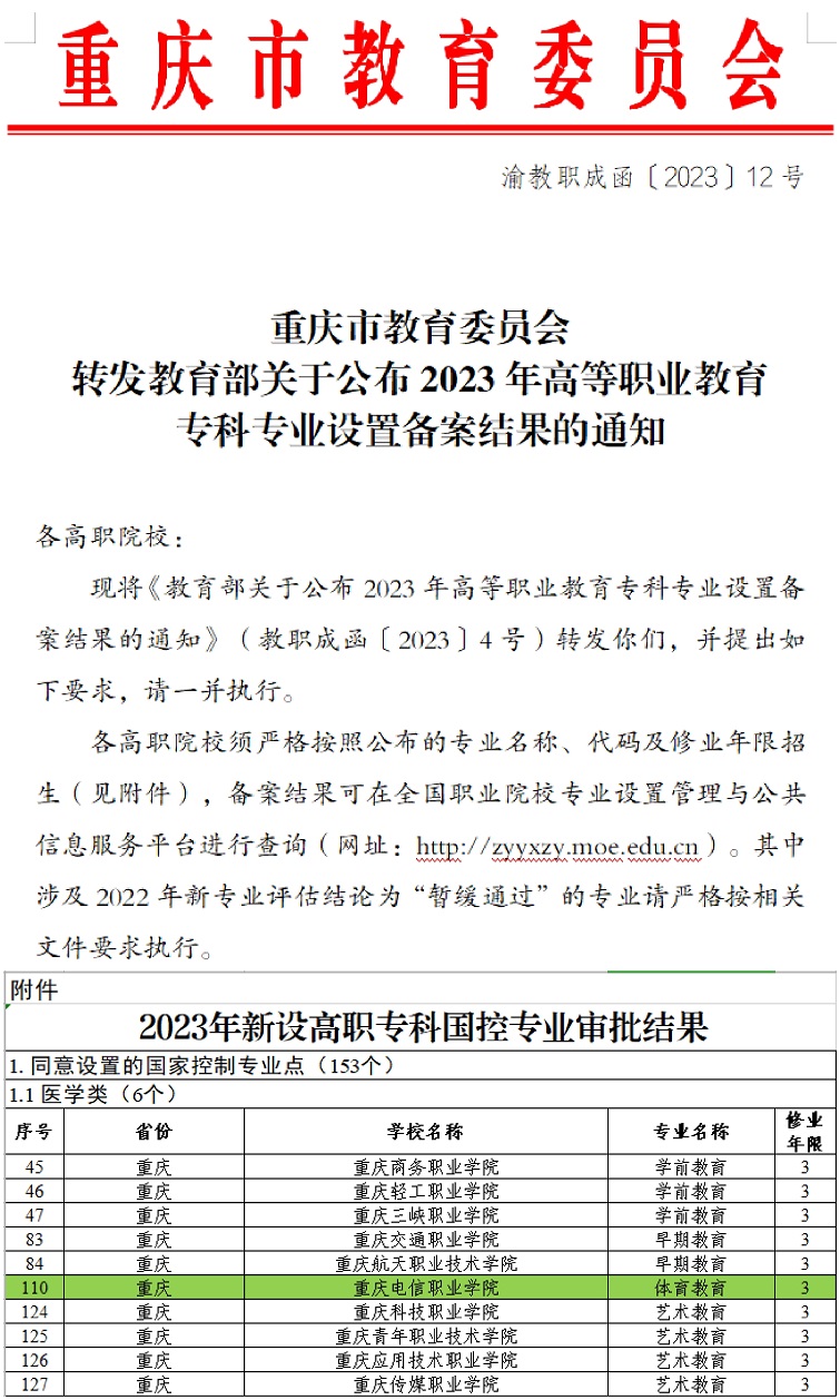 近日,从《重庆市教育委员会转发教育部关于公布2023年高等职业教育专科专业设置备案结果的通知》(渝教职成函〔2023〕12号)文件中获悉,我校申报的体育教育(国控专业)和城市轨道交通运营管理,智能控制技术,信息安全技术应用共4个专业全部获教育部审批通过 91视频网站在线观看,自2023年秋季开始正式招生。
