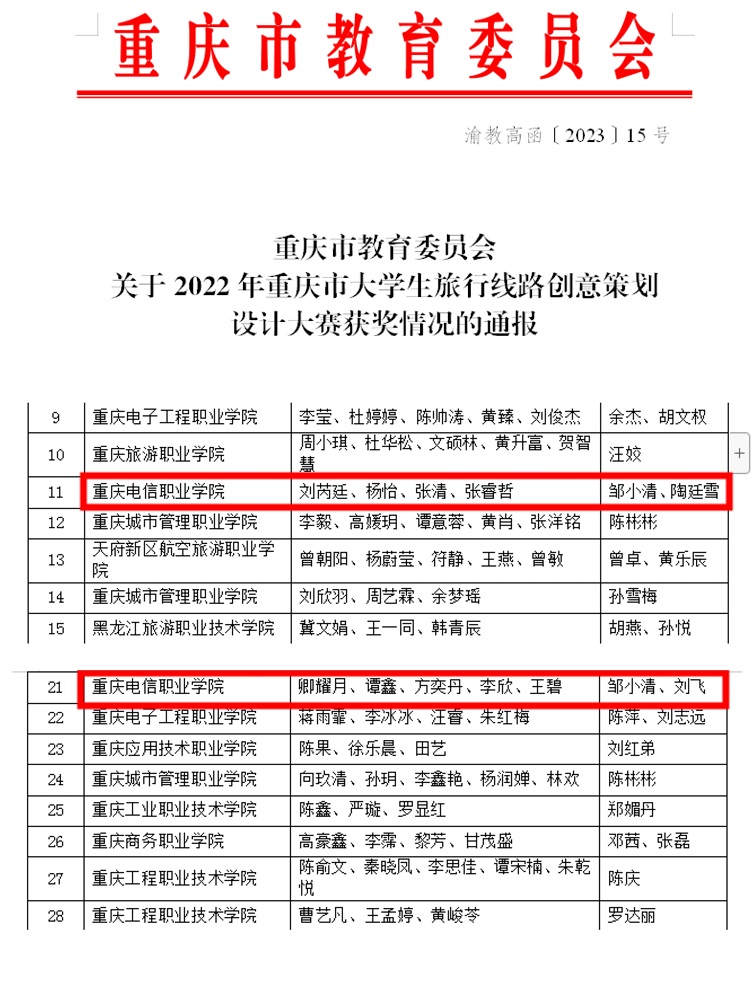 【电信快讯】我校学生参加重庆市大学生旅行线路创意策划设计大赛荣获佳绩