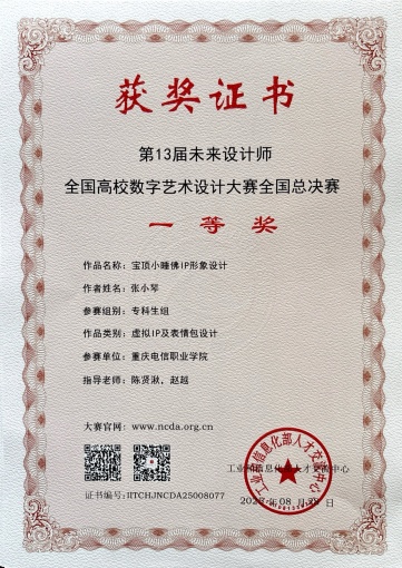 颁奖环节中,我校教师赵越 91视频播放,陈贤湫指导的学生作品《宝顶小睡佛IP形象设计》斩获全国赛(学生组)一等奖,二人同步荣获“全国总决赛一等奖优秀指导教师”称号并登台领奖,教师组竞赛中,赵越,吴智勇,陈贤湫合作作品获全国赛二等奖,展现教师团队实力。