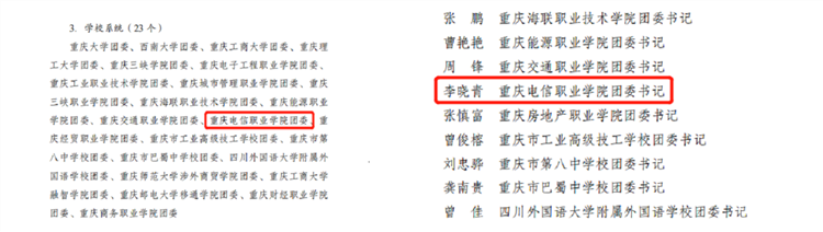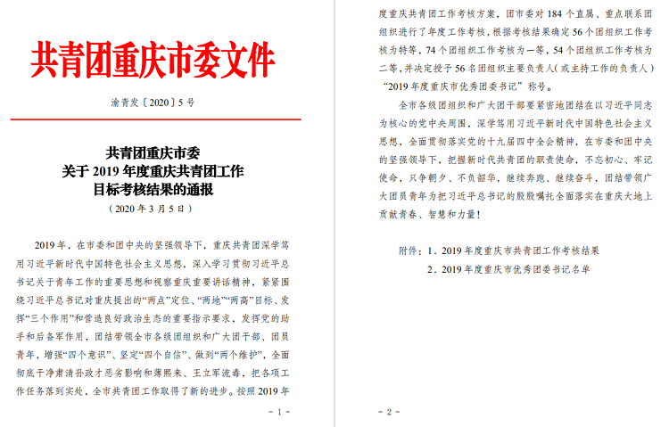 近日,共青团重庆市委下发《关于2019年度重庆共青团工作目标考核结果的通报》(渝青发〔2020〕5 号) 91视频网站在线观看,我校团委继2017年以来,再一次荣获高校系统“特等奖”,团委书记李晓青同志被授予“2019年度重庆市优秀团委书记”荣誉称号。