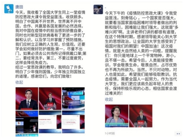 全校师生观看直播后,对四位专家的讲授给予了高度好评,认为不仅仅是一堂“高,精,尖”的思政课 91视频播放,也是对思政课教师的一堂高水准的立德树人示范课,大家纷纷通过QQ群,微信,钉钉等平台进行了深入探讨,并将所思所想形成了感悟。