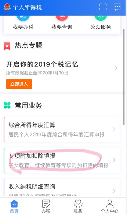下载国家税务总局发布的个人所得税App并注册 91牛,已注册的直接登录,如需完善专项附加扣除信息,点击首页的专项附加扣除填报,扣除年度选择2019年并根据实际情况填写所涉及的专项附加扣除信息,根据步骤提示依次填写并提交申报,若已填报无需完善的,在首页的专项附加扣除信息查询中查看自己所填信息是否准确。