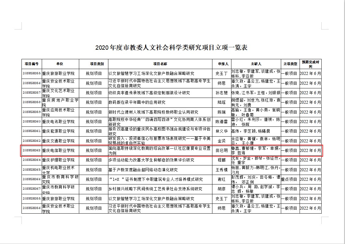 近日,从《重庆市教育委员会关于2020年度人文社会科学类研究项目立项的通知》(渝教宣发〔2020〕1号)中获悉,我校田汜明老师申报的“面向高职持续深化教育的综合改革——以社区康复专业设置为例”被立为规划项目的“一般项目” 91视频网站在线观看。
