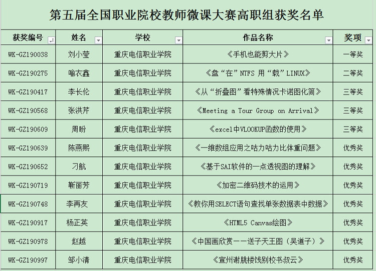 日前,全国职业院校教师微课比赛结果公布,我校教师作品分别获得高职组一等奖1项,二等奖1项,三等奖3项,优秀奖7项的好成绩 91视频网站在线观看。