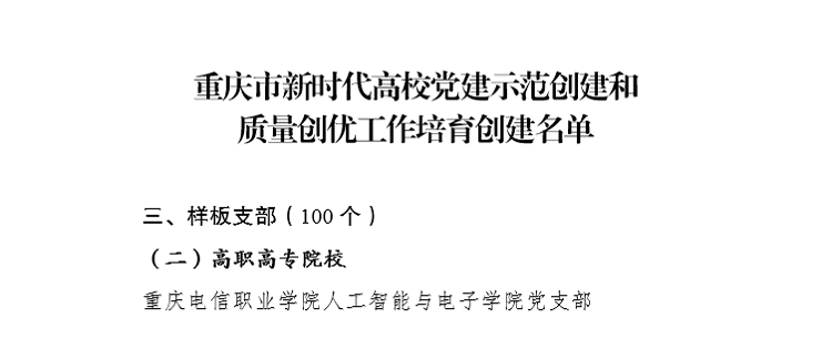 近日,从《中共重庆市委教育工作委员会关于公布重庆市新时代高校党建示范创建和质量创优工作培育创建名单的通知》渝教工委发〔2020〕55号文件中获悉,我校人工智能与电子91牛党支部进入新时代高校党建“双创”工作培育样板支部名单 91视频网站在线观看。