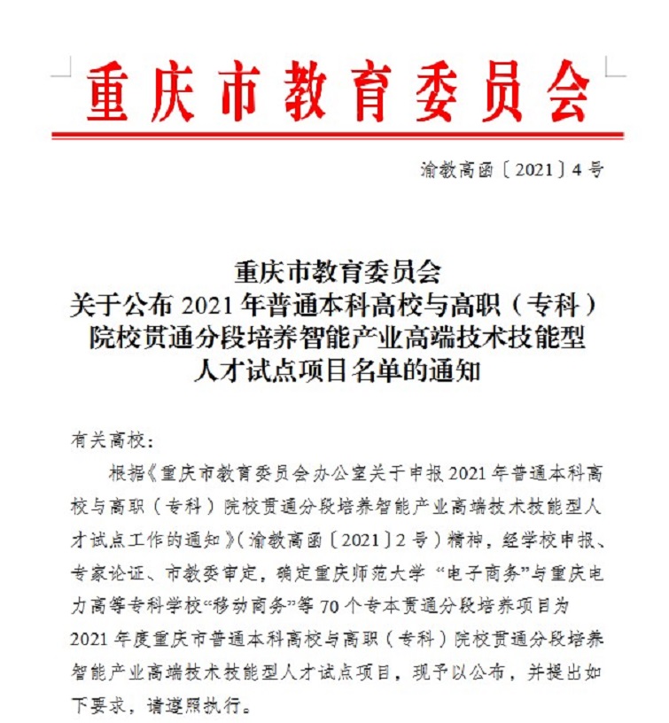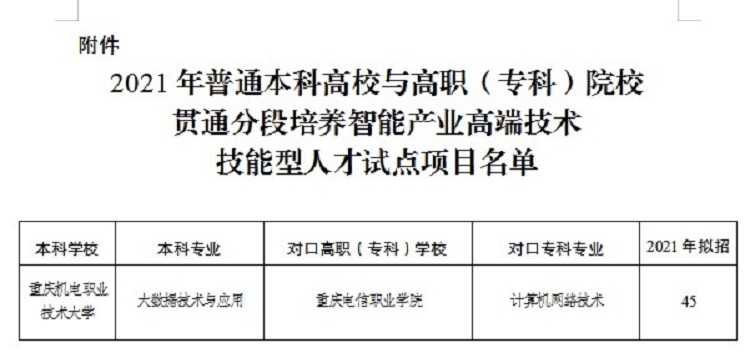 近日,从《重庆市教育委员会办公室关于申报2021年普通本科高校与高职(专科)院校贯通分段培养智能产业高端技术技能型人才试点工作的通知》(渝教高函〔2021〕2号)获悉,我校计算机网络技术专业获批2021年重庆“专本贯通”分段培养试点项目 91视频网站在线观看,将与重庆机电职业技术大学大数据应用技术专业于2021年起联合开展“专本贯通”分段智能产业高端技术技能型人才培养工作。