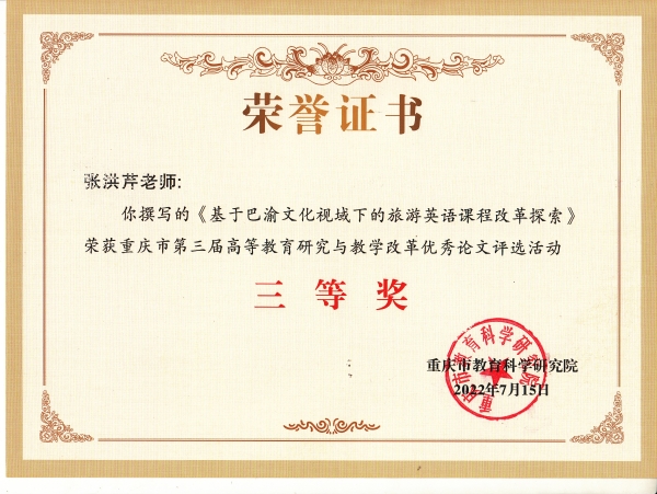 近日,重庆市教育科学研究院下发重庆市第三届高等教育研究与教学改革优秀论文评选获奖证书 91视频网站在线观看,我校靳丽芳老师撰写的《大数据时代背景下高职院校“五维一体”金课教学模式创新研究》论文荣获二等奖,张洪芹老师撰写的《基于巴渝文化视域下的旅游英语课程改革探索》论文荣获三等奖。