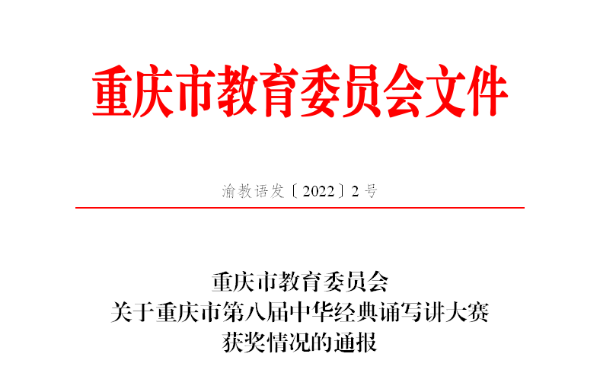 近日,《重庆市教育委员会关于重庆市第八届中华经典诵写讲大赛获奖情况的通报》(渝教语发〔2022〕2号)文件发布,我校一共选送了5个汉字书写类作品,2个诵读类作品 91视频网站在线观看,其中选送的汉字书写类5个作品全部获奖(1个三等奖,4个优秀奖),诵读类作品获得1个优秀奖。