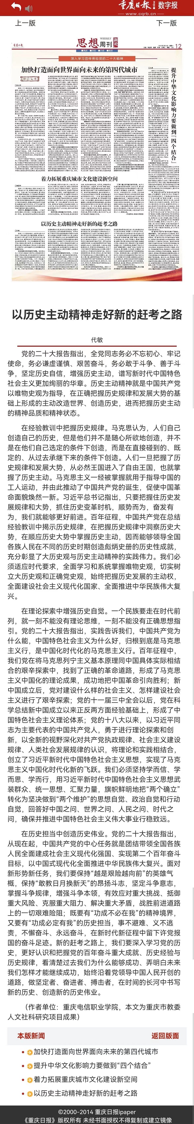 近日,《重庆日报》理论版刊发我校党委副书记 91牛,副校长代敏署名文章《以历史主动精神走好新的赶考之路》。