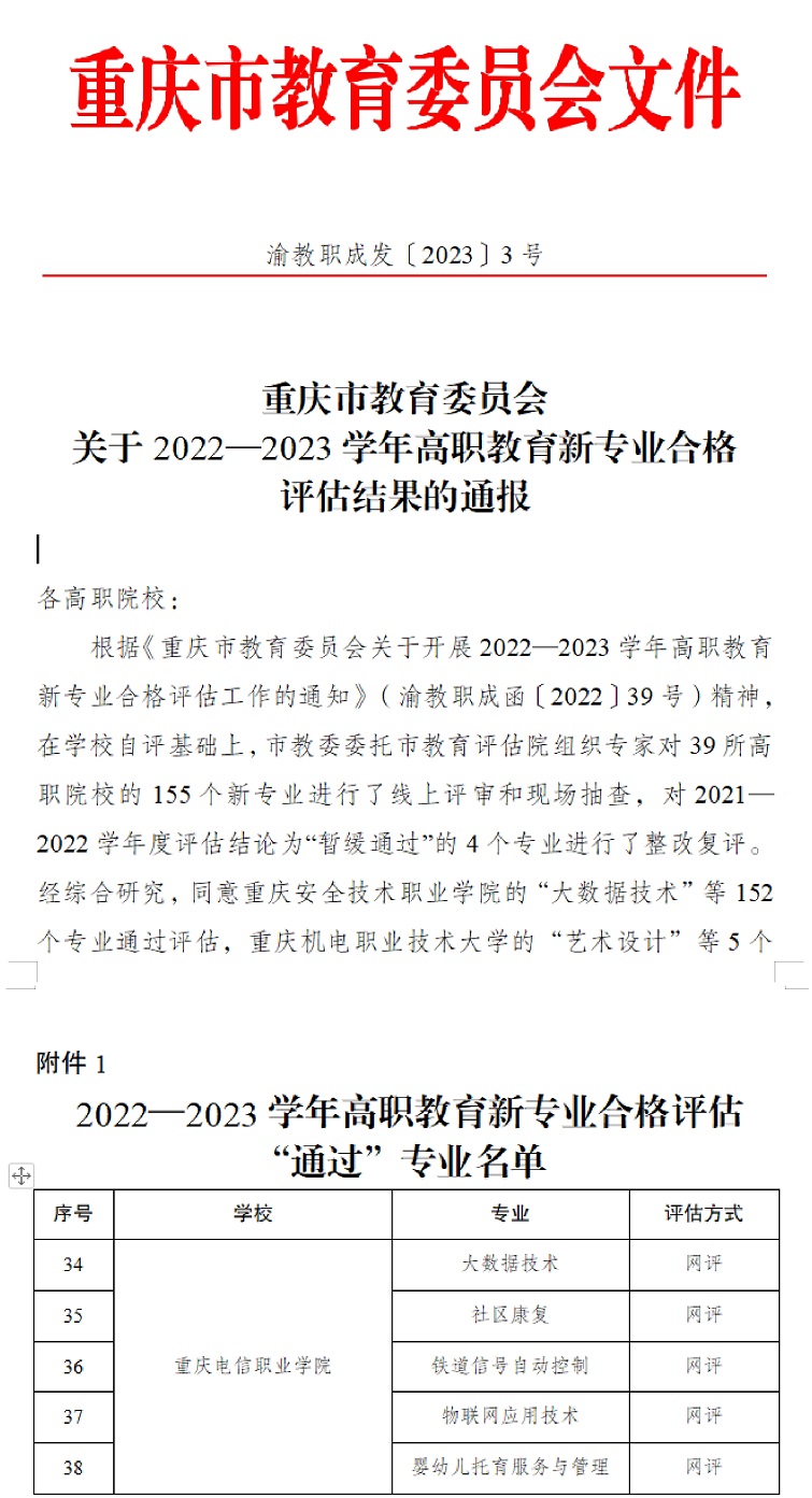 近日,91视频网站在线观看从《重庆市教育委员会关于2022—2023学年高职教育新专业合格评估结果的通报》(渝教职成发〔2023〕3号)文件获悉,我校大数据技术、社区康复、铁道信号自动控制、物联网应用技术、婴幼儿托育服务与管理5个新专业全部通过2022-2023学年高职教育新专业合格评估。