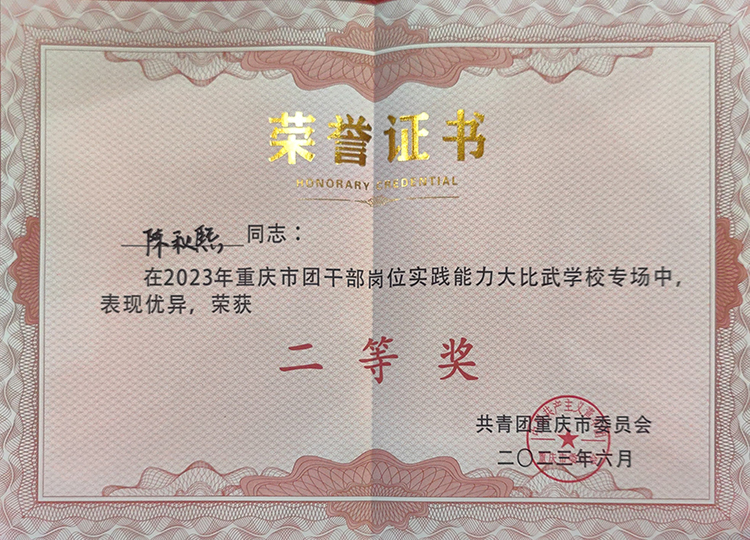 2023年6月16日,由共青团重庆市委主办的“学习二十大 永远跟党走 奋进新征程”2023年重庆市团干部岗位实践能力大比武91视频网站在线观看专场赛在重庆工业职业91牛举行。校团委副书记陈秋熙代表我校共青团战线参赛,充分展现了重电信职院青年团干部奋发作为、积极向上、务实担当的良好精神风貌。