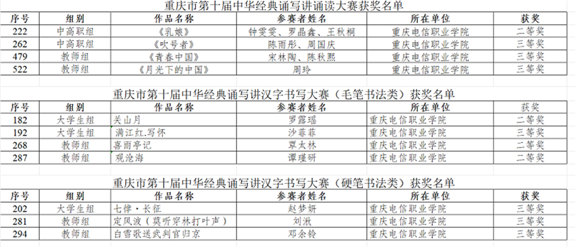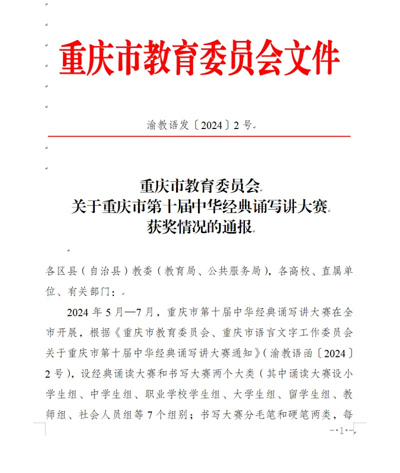 近日,重庆市第十届中华经典诵写讲大赛落幕,此次大赛由重庆市教育委员会,重庆市语言文字工作委员会主办 91视频网站在线观看,设经典诵读大赛和书写大赛两个大类,我校师生积极参与,经过激烈的角逐,其中4个诵读,7个书法作品,共计11个参赛作品获奖,再次突破参加此项比赛的历史最好成绩。